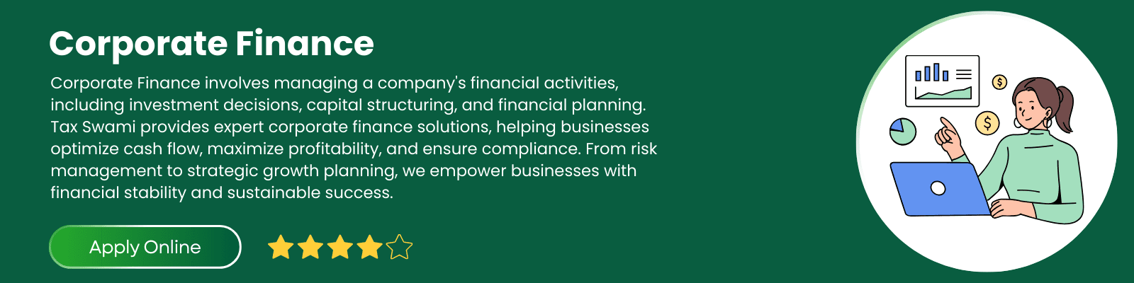 At Tax Swami, we provide end-to-end corporate finance solutions that drive business success. Whether you need capital management, investment advisory, or risk mitigation strategies, we are here to support your financial journey. Contact us today to explore how we can help your business grow!
