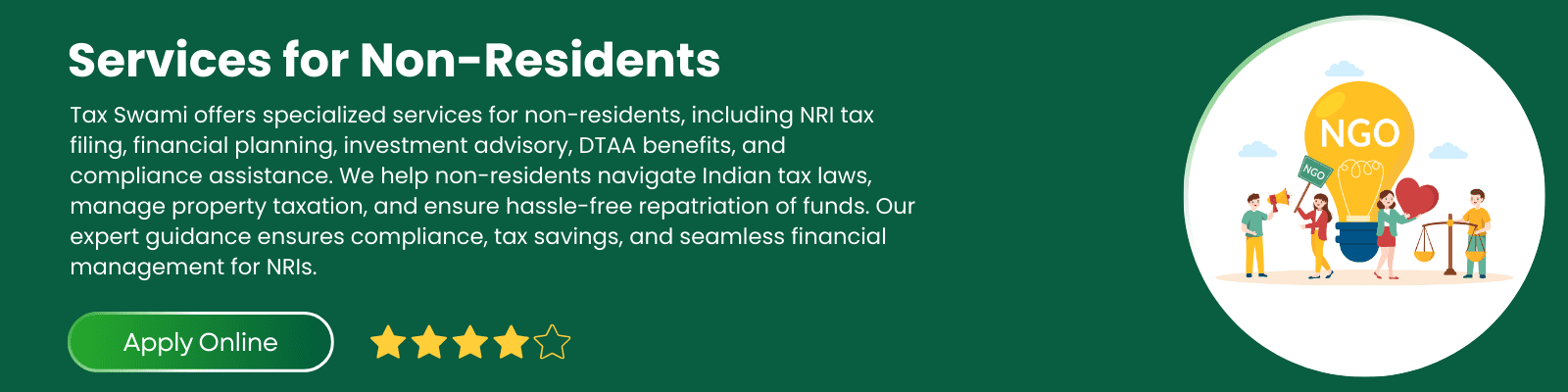 At Tax Swami, we simplify taxation and compliance for non-residents with expert solutions tailored to their needs. Our experienced professionals ensure seamless financial management, legal compliance, and maximized benefits for NRIs and foreign investors. Contact us today to get personalized solutions for all your financial and tax-related concerns as a non-resident!